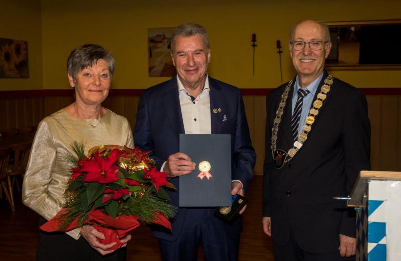 Bürgermeister Hans Schmid (rechts) überreicht die Bürgermedaille in Silber an Hans Motzer und dankte seiner Ehegattin Ilse mit einem Blumenstock.